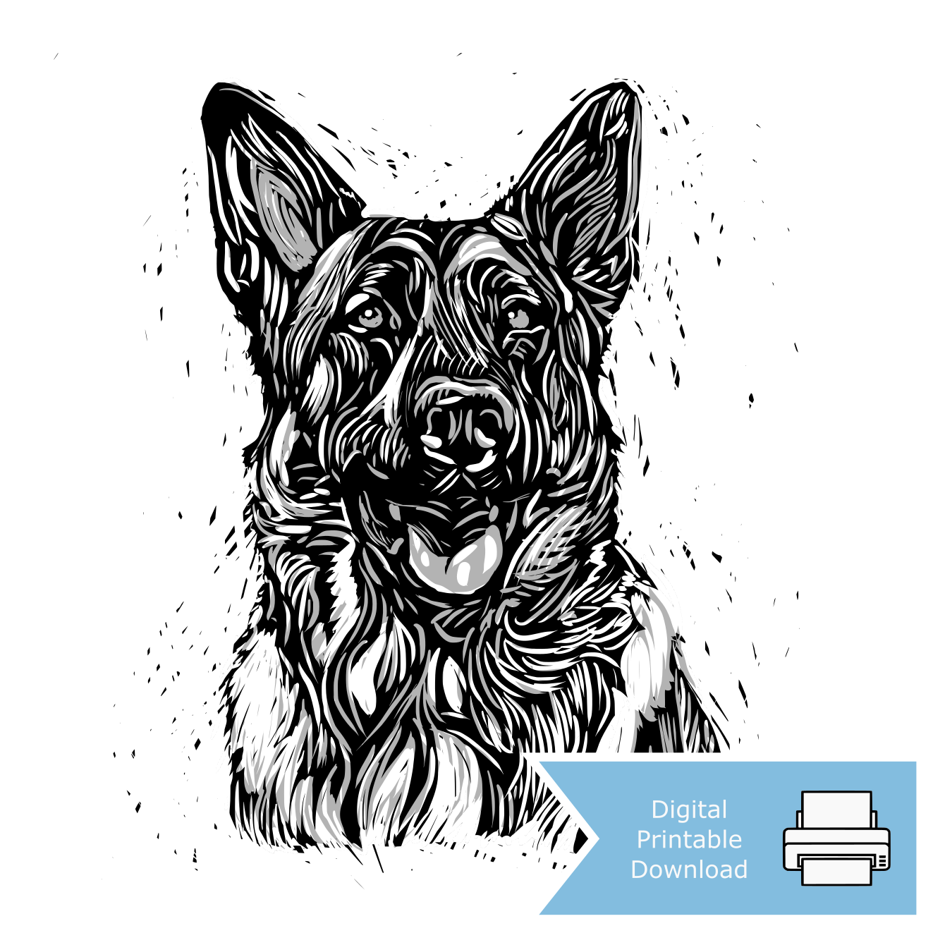 This German Shepherd illustration reflects the confident posture and attentive expression that define the breed. Known for their intelligence, loyalty, and steady presence, there’s a sense of calm awareness here—ears forward, gaze focused, always taking in the world around them.
